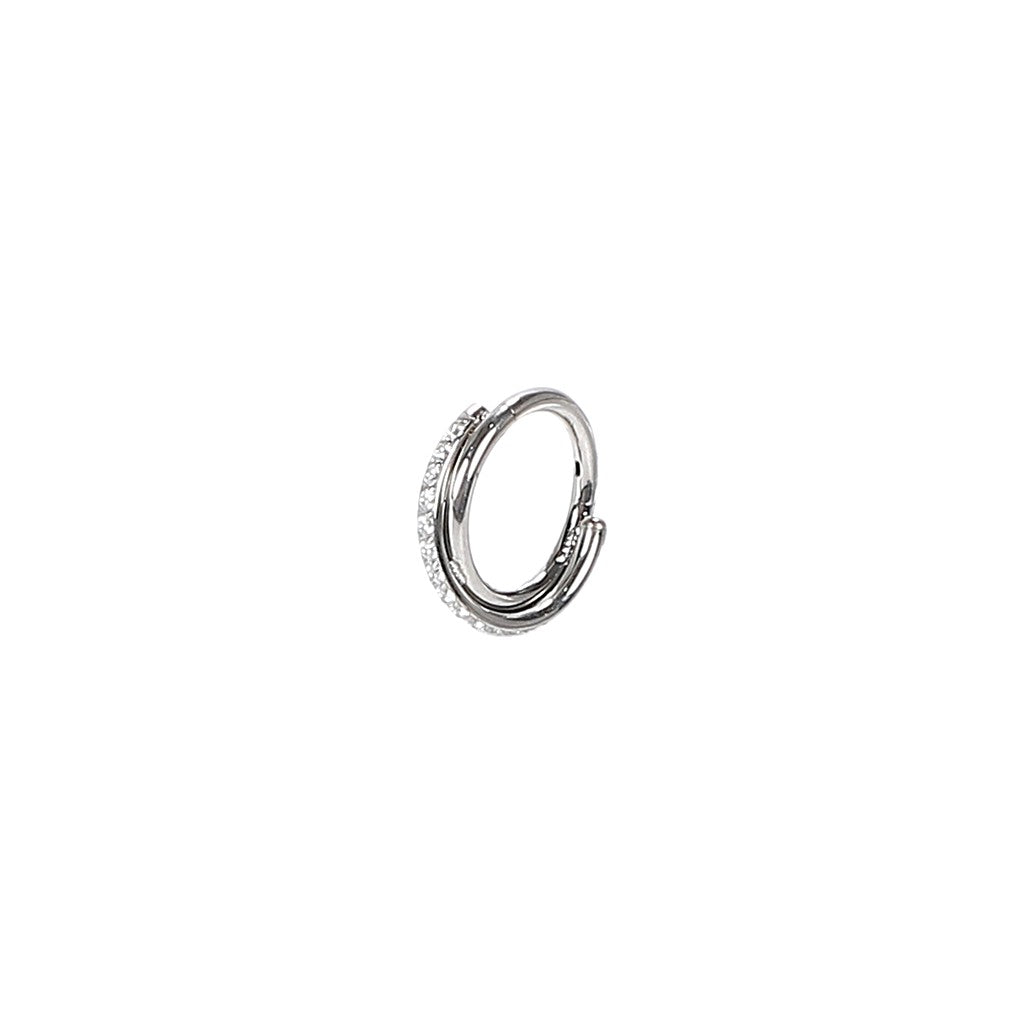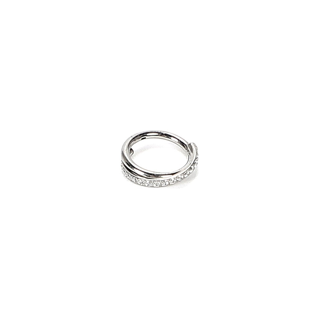 メタル(サージカルチタン)とパヴェのラインが交差するデザインのクリック式フープ。陰影ときらめきのコントラストが特徴。