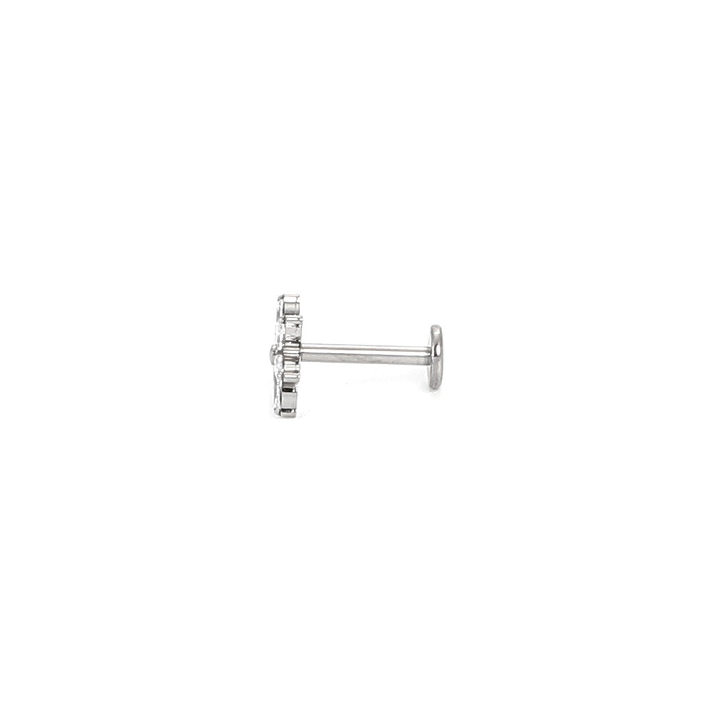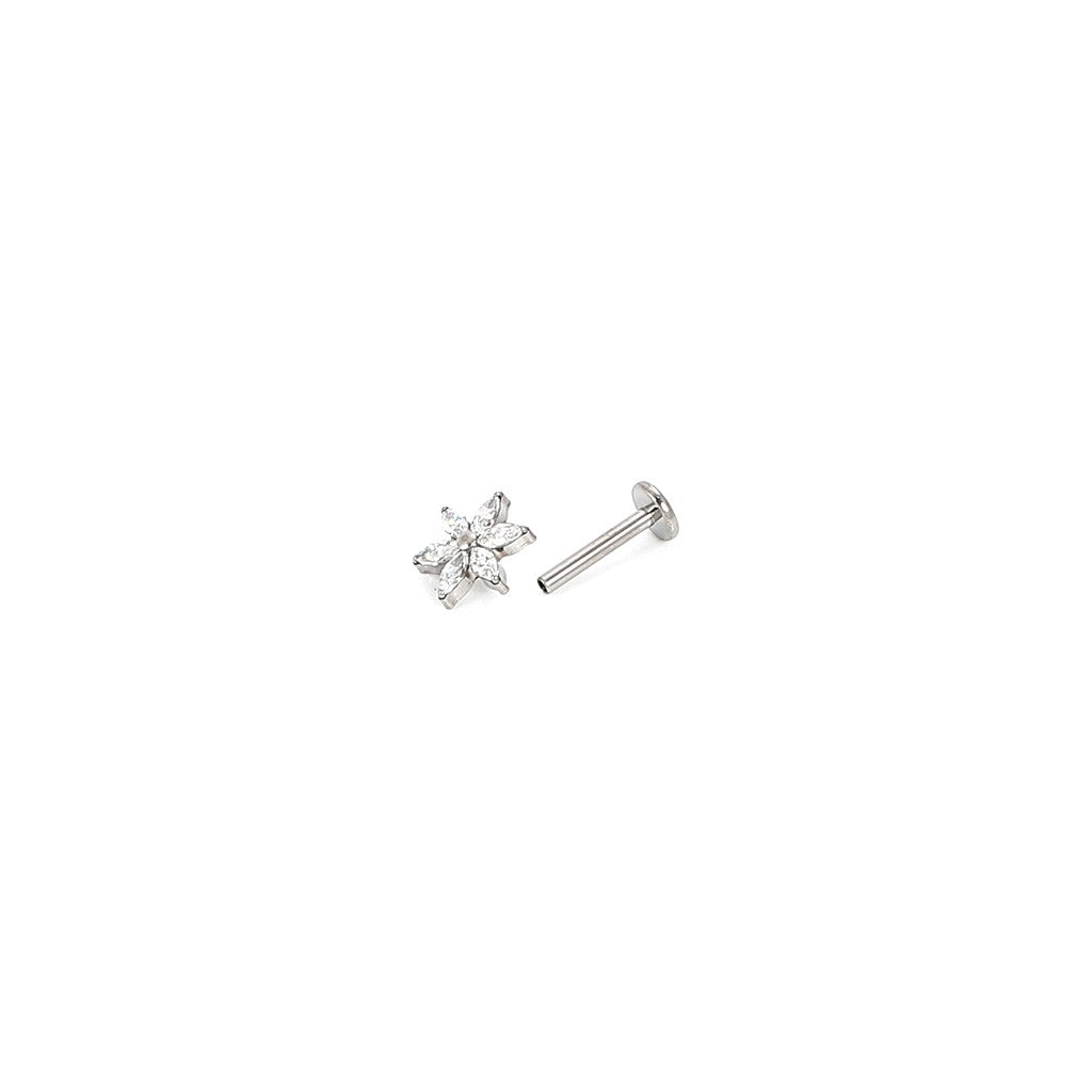 マーキス形状のストーンを花びらに見立てた小花モチーフ。可憐で清楚。 ねじ式のフラットバックで装着感が安定するラブレット。肌にやさしいサージカルチタン製ボディ(16G=約1.2mm)。マスクや髪に絡みにくく、就寝時も快適。ポスト長 8mmから選べ、耳たぶや軟骨まで幅広くフィットします。金属アレルギー対応で、シーンを選ばず上品に輝きます。