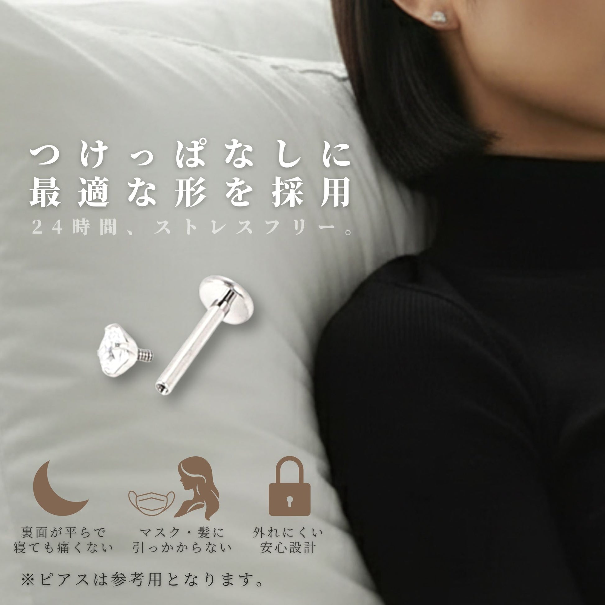 ポストやキャッチなど金属部分はすべてチタン製で、汗や水にも強く、毎日安心して使えます。